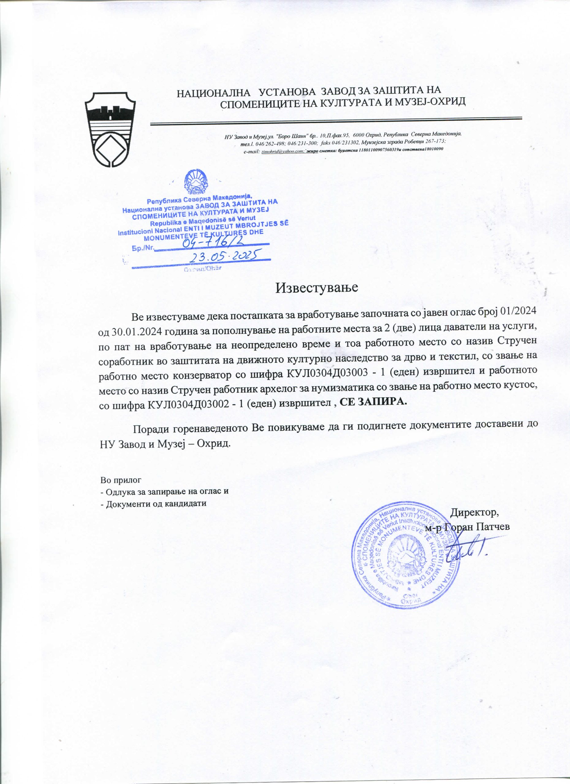 НУ ЗАВОД ЗА ЗАШТИТА НА СПОМЕНИЦИТЕ НА КУЛТУРАТА И МУЗЕЈ – ОХРИД