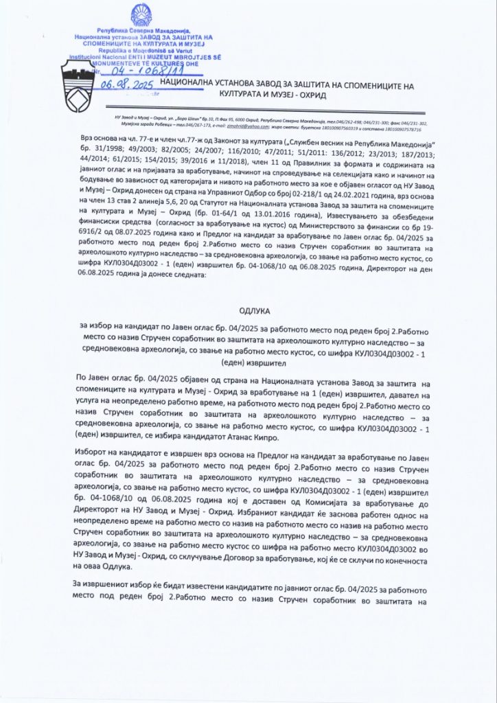 НУ ЗАВОД ЗА ЗАШТИТА НА СПОМЕНИЦИТЕ НА КУЛТУРАТА И МУЗЕЈ – ОХРИД