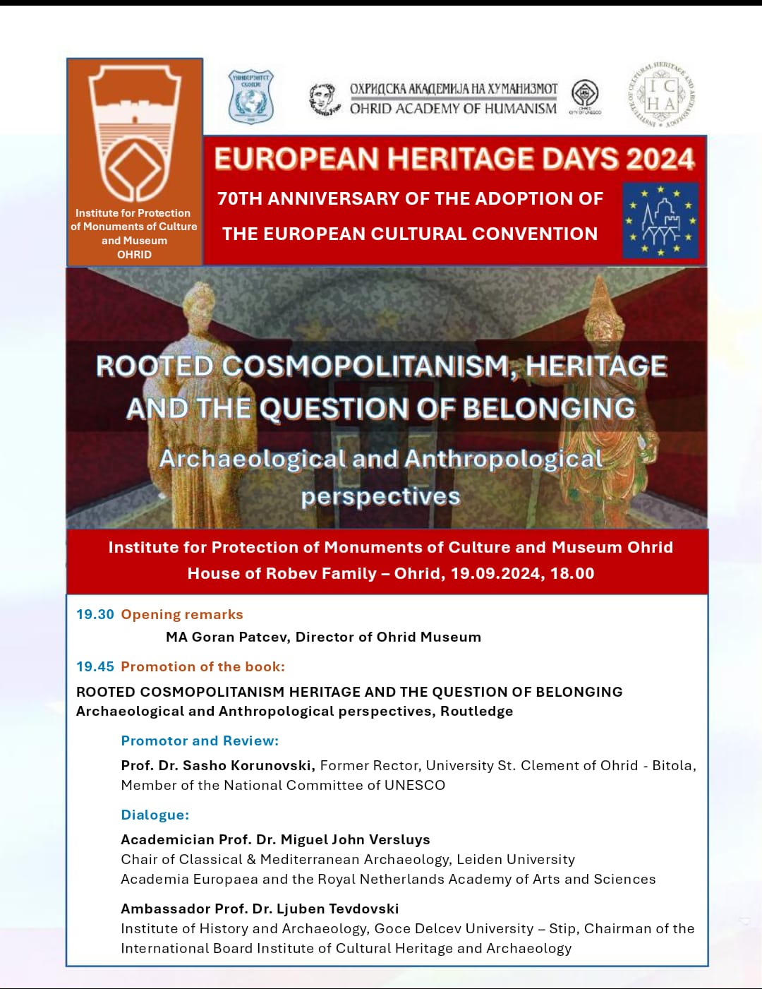 По повод Европските денови на културното наследство 2024, и одбележувањето на 70 години од усвојување на Европската културна конвенција (Париз 1954), нашата установа се приклучува кон одбележувањето со промоција на книга од Академик Проф Др Мигуел Џон Вершлаус со наслов „Вкоренет космополитизам, наследство и прашањето за припадност“ (Rooted Cosmopolitanism, Heritage and the Question of Belonging), која ќе биде промовирана од страна на Проф. д-р Сашо Коруновски во диалог со Амбасадорот Проф. д-р Љубен Тевдовски и М-р Горан Патчев.